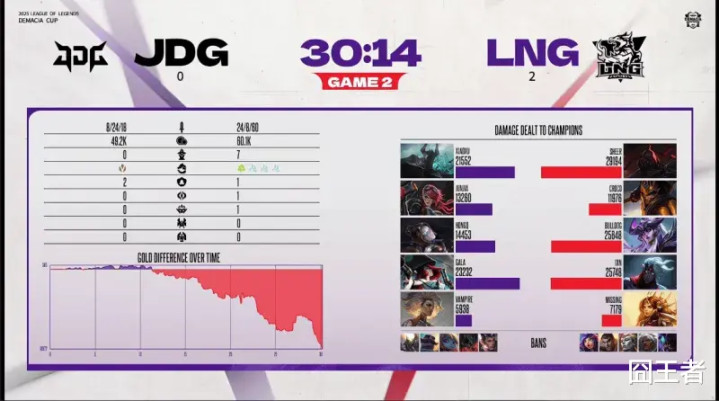 结果第二局比赛,依旧是被LNG打成了单方的碾压局。前15分钟双方打得比较平淡,经济一直无法拉开。17分钟左右,Croco抢下先锋并秒掉JunJia,Xiaoxu惨遭拉扯LNG拿下0换3团战;21分钟左右,LNG厄塔汗团战完成3换5;23分钟左右,双方再次爆发团战,LNG完成0换4并拿下厄塔汗;最终30分14秒,LNG团灭JDG,赢下比赛。