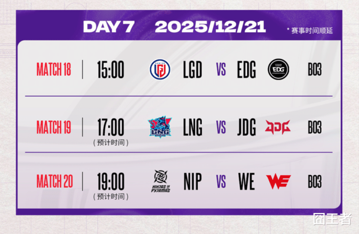 12月21日,三场比赛由LGD对阵EDG,LNG对阵JDG,以及NIP对阵WE带来。在率先结束的比赛中,EDG三局击败LGD;那么,LNG和JDG,谁又会笑到最后呢,让我们拭目以待。