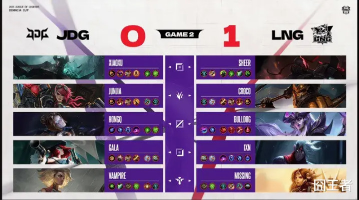 第二局比赛,JDG蓝色方,禁用:赵信;剑魔;波比;布隆;潘森,选用:Xiaoxu铁男;Junjia蔚;HongQ发条;GALA女枪;Vampire芮尔;LNG红色方,禁用:妮蔻;杰斯;亚恒;狼母;雷克赛,选用:sheer塞恩;Croco皇子;BuLLDoG辛德拉;1xn韦鲁斯;MISSING蕾欧娜